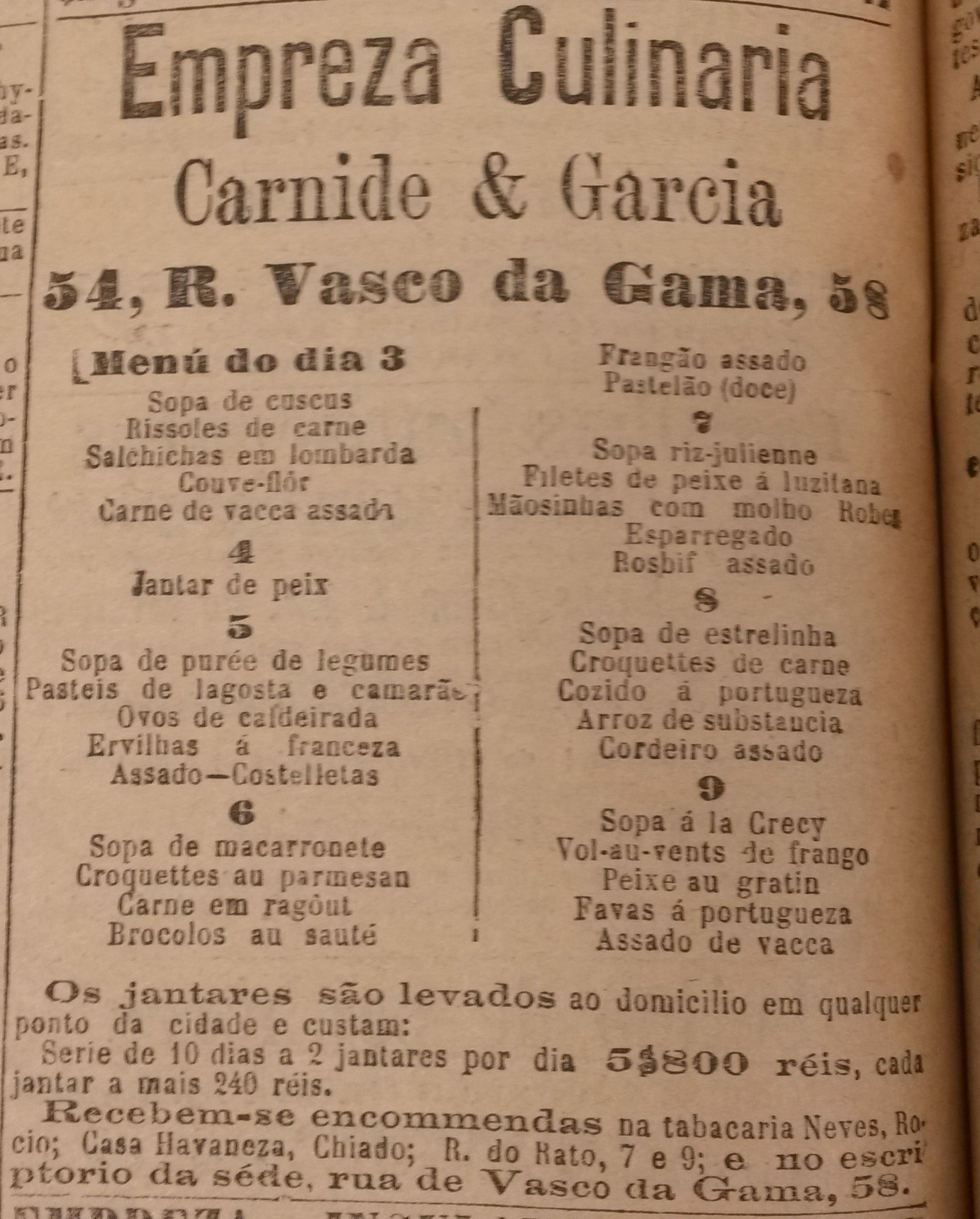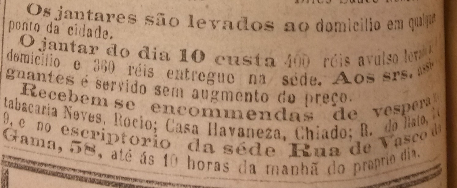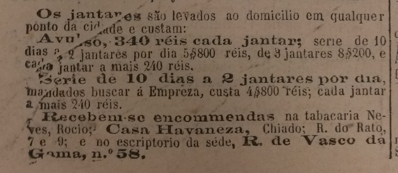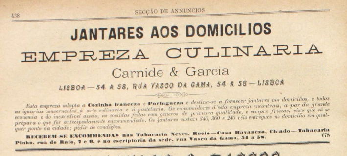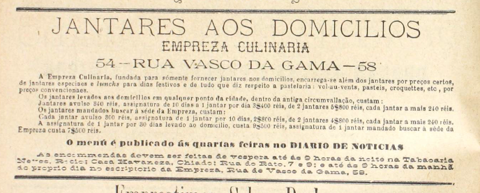 Em 1896, uma empresa de nome Empreza Culinária fez-se anunciar no Annuario Commercial. Sediada em Lisboa, integrava um mercado pontuado por vários estabelecimentos comerciais como pastelarias, confeitarias e restaurantes que disponibilizavam serviços de venda de refeições prontas, destacando-se destes pelo serviço exclusivo de produção e pela venda de refeições com possibilidade de entrega ao domicílio, cujas encomendas assentavam numa curiosa rede de tabacarias de renome a si associadas. Dois anos depois, em 1898, a empresa investiu numa estratégia publicitária mais estruturada e iniciou a publicação dos menus de refeições semanalmente em um dos jornais de maior tiragem da capital, o Diário de Notícias. A evolução da comunicação da Empreza Culinária com os consumidores, a forma como usou a imprensa periódica e os serviços que fez publicitar permitem conhecer com maior pormenor a natureza e a logística de uma empresa de venda de refeições “take-away”/”delivery” muito próxima dos modelos atuais e que se apresenta como um tipo de serviço alimentar original à época.